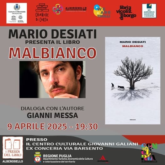 ‘Malbianco’, il romanzo di Mario Desiati che indaga il rapporto tra l’individuo e le sue radici, sarà presentato ad Alberobello il prossimo 9 aprile alle 19.30 nella sede del Centro culturale Giovanni Galiani (ex conceria).